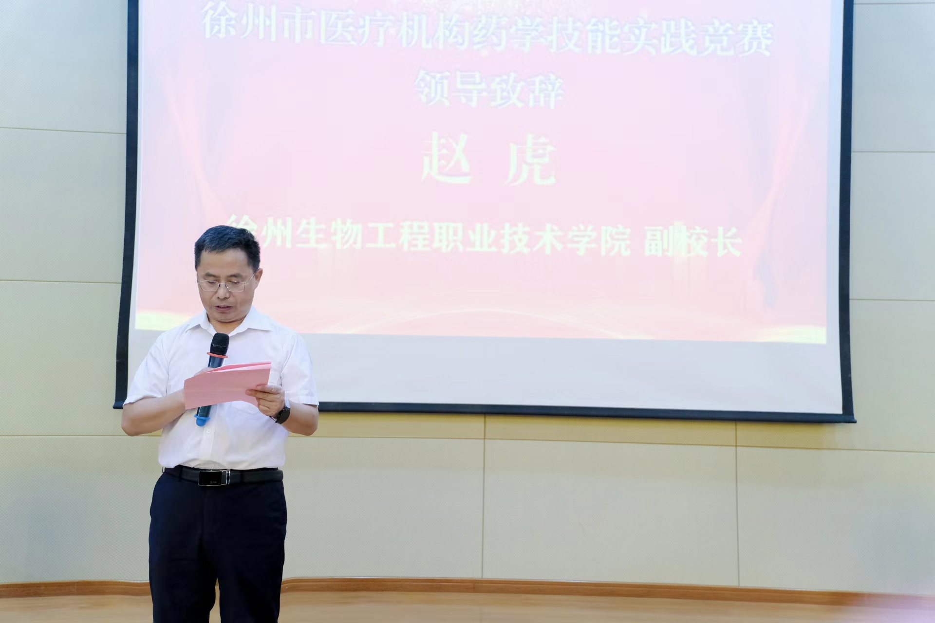 7月21日,由徐州市卫生健康委员会、徐州市总工会、徐州市药学会主办,我校承办的2023年徐州市医疗机构药学技能实践竞赛在我校成功举办。徐州市总工会副主席王建民、徐州市卫生健康委员会副主任杨洪涛、徐州中医药管理局副局长姜勇、校党委委员副校长赵虎、徐州市药学会理事长陈建民等出席并为获奖选手颁奖。我校药品食品学院100多名师生现场观摩学习,其中宋凯、吴江涛、于秋菊、蔡琳等四名教师执裁决赛阶段比赛。